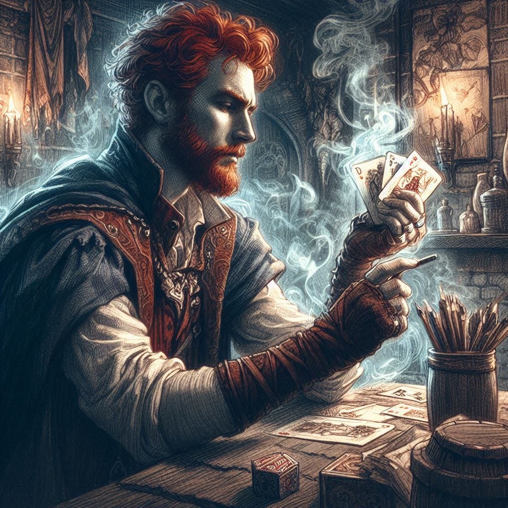 Dorian is playing a card game, but it’s not as fun as it seems. His playmates are high-level politicians in Karadria, and he wants to win knowledge more than money.
